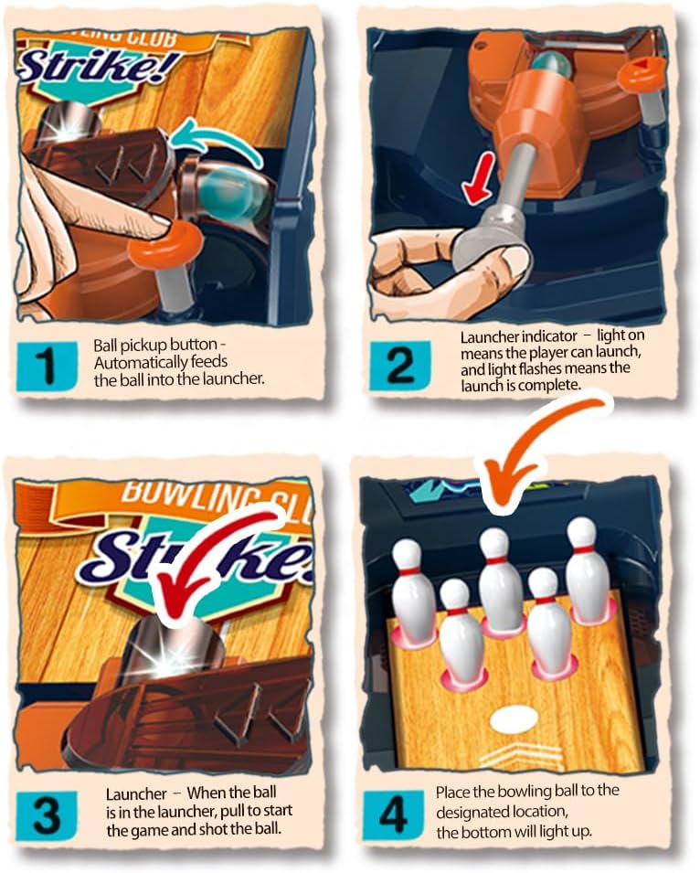 Bring home a lively bowling experience kids actually reach for. A built-in display shows progress at a glance while light-up reactions and sound effects celebrate every hit, turning practice rolls into big moments. The spring handle gives real control — pull back, aim, release — and each shot feels crisp and repeatable, helping young players develop timing and coordination without screens. The lane stretches to nearly three feet, long enough to feel authentic yet compact enough for a coffee table or floor play space. Sections click together in minutes and tuck away neatly, so it’s easy to set up quick rounds between homework, after dinner, or during rainy-day play. Try solo sessions to master aim, then invite a sibling or parent for friendly face-offs; short games keep everyone involved and smiling. (BATTERIES NOT INCLUDED) Ideal for family nights, playdates, and even quick office breaks, this set brings bright feedback, tactile control, and repeat-play appeal in one box. Set it down, load a ball, and roll — fun begins immediately.