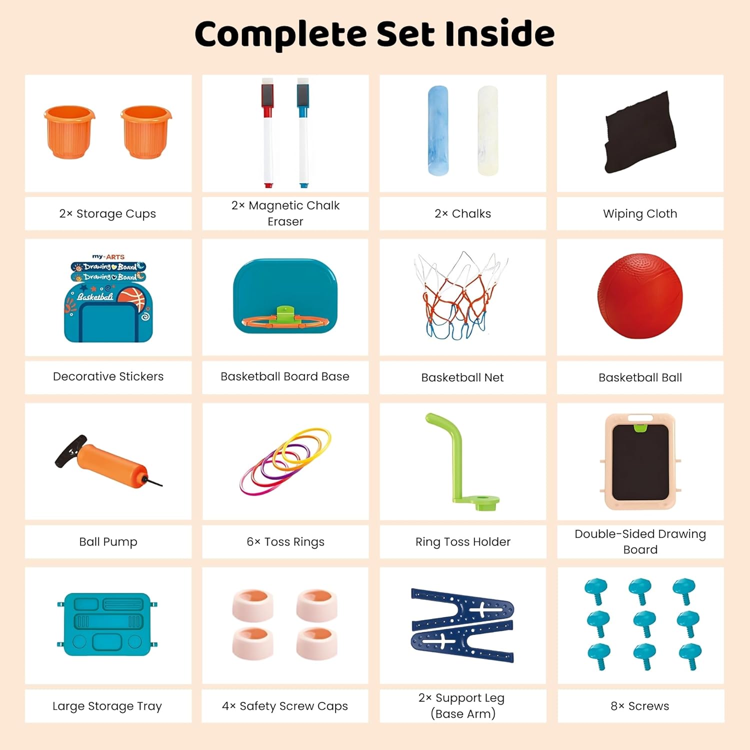 Unleash your child’s imagination with this easel toddler that brings together creativity and active fun. Whether it's quiet drawing time or energetic movement, this art station for kids supports every play style. Kids can practice writing on a smooth surface, explore early learning through drawing, or enjoy fun physical games after art time. Use it as a writing board for kids age 3-5 to build foundational skills or as a kids white board dry erase easel for colorful creations. Its compact size makes it easy to use as a table easel for kids or even an outdoor art easel for kids on sunny days. Lightweight and portable, this chalk and white board easel for kids is a flexible fit for playrooms, classrooms, and beyond. Families looking for ideal activity toys will appreciate its all-in-one design. From quiet sketching to tossing rings and scoring baskets, this kids writing board with stand transforms playtime into learning and movement. A balanced mix of fun, focus, and creativity — all in one standing drawing board for kids.