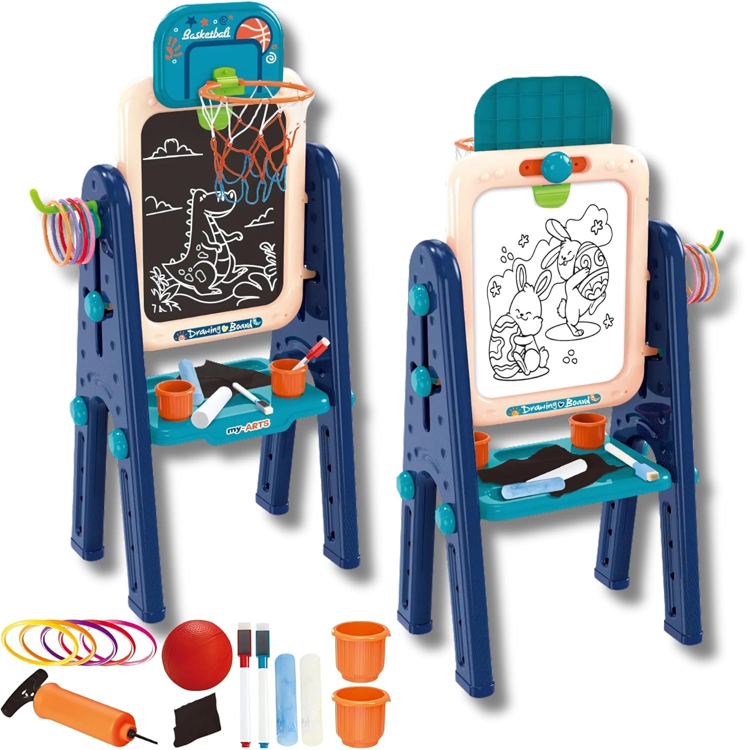 Easel for Kids – 4 in 1 Double Sided Toddler Art Easel with Magnetic Whiteboard, Chalk Board, Basketball Hoop & Ring Toss Game – Multifunctional Easel with Drawing Accessories for Ages 3+