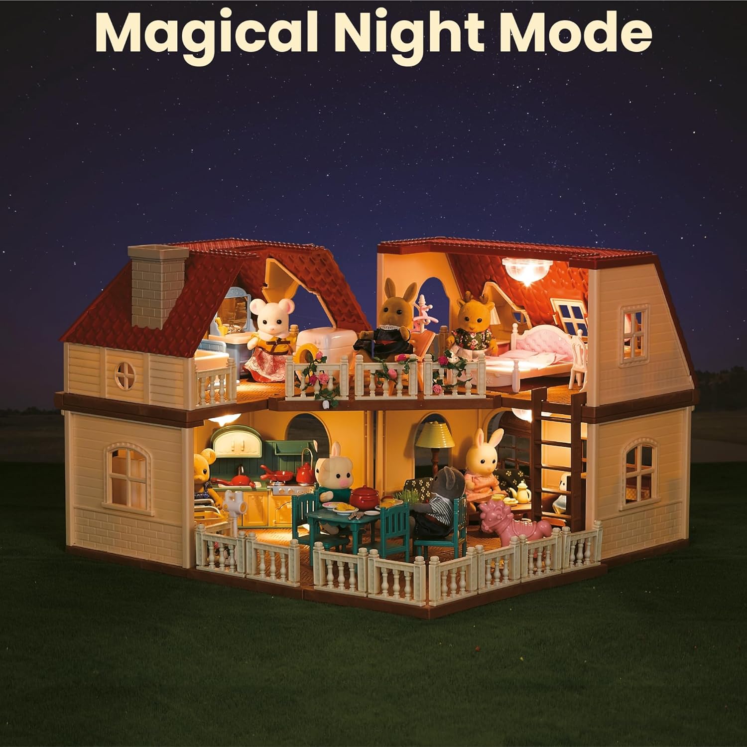 Family Grand Doll House — Light-Up 2-Story Cozy Cabin with Furniture & Bunny Figure, Complete Dollhouse Playset for Creative Pretend Play, Gift for Kids Ages 3+