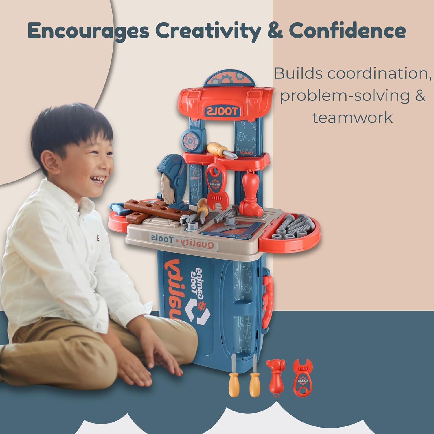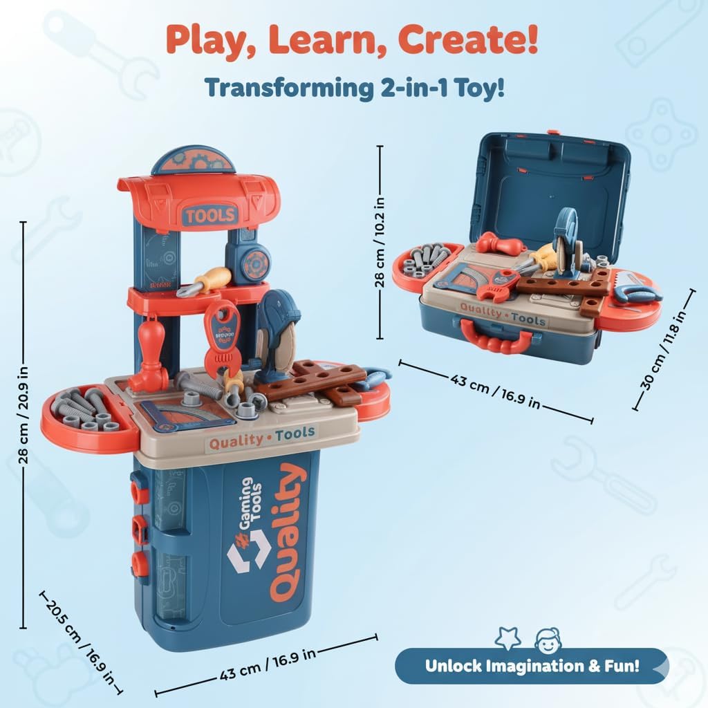 Kids Tool Set — 3 in 1 Portable Workbench & Suitcase Playset, Compact Construction Kit with Pretend Tools, Storage & Travel Design for Boys Ages 3+